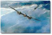Shortly before the first 8th USAAF daylight bombing raids on Berlin, elements of the 82nd Fighter Squadron are seen crossing the English coastline just south of Dover. Led by 2nd Lt. Grant M. Turley, a young rancher who had recently become Arizona’s first fighter ace of WWII, this peaceful scene belies what would soon follow on March 6, 1944, when the 8th Air Force suffered its single largest loss of men and aircraft in a single day. Turley was one of the courageous pilots who lost their lives on that day, defending the Flying Fortress and Liberator bombers from German fighters while flying the P-47D he’d nicknamed “Kitty” in honor of his wife.