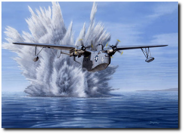 The big, tough Martin flying boats were already in service prior to America's entry into World War II and were real workhorses throughout the war in both the Atlantic and Pacific Oceans. Mariners were quickly adapted to the role of anti-submarine warfare against the Nazi U-boat wolf packs in early 1942. Production of Mariners continued until 1949 and they served with the U.S. Navy on into the 1950s during the Korean War before being phased out. This picture shows a Mariner over calm seas attacking a submerged U-boat with a low-level depth charge run. The aircraft's ordnance was carried in a unique bomb bay located in the engine nacelles. It also had the capability of carrying torpedoes under the wings.