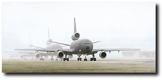 In "The Extenders," by artist Dru Blair, several KC-10’s are depicted lining up for take off as the crews prepare to launch yet another vital support mission. The fog shrouded runway creates an aura of intrigue and mystique, and is consistent with the quiet reputation of this essential, but often overlooked aircraft as it carries out its critical task. The KC-10 is known for its awesome power, and it is rumored that were it not for the effects of drag, and the necessity of an atmosphere for the air-breathing engines, the KC-10 is powerful enough to achieve orbit.