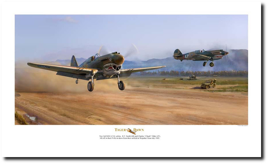 This image depicts two well-known Third Squadron “Hell's Angels” pilots, Robert. “R.T.” Smith and Charles “Chuck” Older taking off from Wujiaba in the early morning for a raid on a Japanese airfield in June 1942. It is warm and humid as morning fog and mist lifts creating a hazy view of the mountains in the distance.